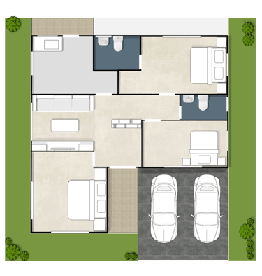 แบบบ้านเดี่ยว ในตัวบ้านประกอบด้วย 3 ห้องนอน 2 ห้องน้ำ โดยห้องนอนเป็นห้องขนาดใกล้เคียงกัน ห้องนอนมีห้องน้ำในตัวจำนวน 1 ห้อง ห้องน้ำ 1 ห้อง ห้องรับแขก ห้องครัวไทยในบ้าน
