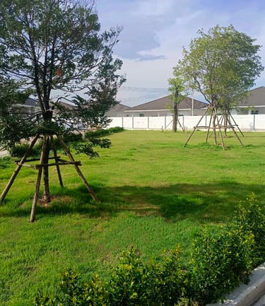 พื้นที่สวนกลางเป็นสนามหญ้า บรรยากาศร่มรื่น ในโครงการมีต้นไม้ใหญ่ ทั้งที่ส่วนกลาง และบริเวณบ้านบางส่วน ทั้งตัวโครงการล้อมรอบด้วยคลอง ทำให้บรรยายกาศค่อนข้างดี
