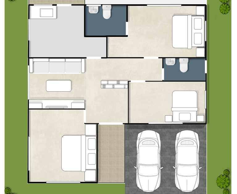 แบบ บ้านเดี่ยว ในตัวบ้านประกอบด้วย 3 ห้องนอน 2 ห้องน้ำ โดยห้องนอนเป็นห้องขนาดใกล้เคียงกัน ห้องนอนมีห้องน้ำในตัวจำนวน 1 ห้อง ห้องน้ำ 1 ห้อง ห้องรับแขก ห้องครัวไทยในบ้าน